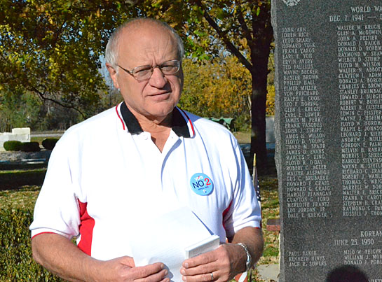 Vietnam era military veteran Larry Mengerink speaks out against State Issue 2 in Memorial Park, stating his opinion that Senate Bill 5, for which Issue 2 is a referendum, discriminates against veterans, as well as takes away collective bargaining rights for teachers, firefighters and other public employees (see article on the three state issues and other election information in Saturday’s independent). (Dave Mosier/Van Wert independent)