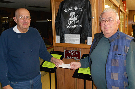 On Thursday, Jan Dunlap, representing the Road Sirs Car Club, presented Van Wert Historical Society Treasurer Ron Kessler with a $1,000 donation toward restoration of the 1917 Overland Opera Touring Coupe. This automobile was originally owned by the Charles Wassenberg family and later sold to the Paul Jones family. It is presently being dismantled and restored by a host of volunteers. It has been estimated that it will cost between $12,000 and $15,000 to completely restore this one-of-a-kind vehicle. There are no known other Overland vehicles of this model in existence in the United States. When restoration is completed in 2-3 years, the vehicle will valued at substantially more than the cost of the restoration. (Historical Society photo)