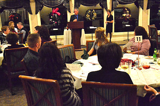 A number of community members bought tickets for a chance to sample various types of beer and wine, as well as bid on themed holiday wreaths and large and small Christmas trees donated for the YW’s Festival of Trees event during “A Toast to the YWCA” fundraiser held Friday evening at Willow Bend Country Club in Van Wert. Both fundraisers support the YWCA’s transitional housing program, which provides housing for homeless women and children. (Dave Mosier/Van Wert independent)