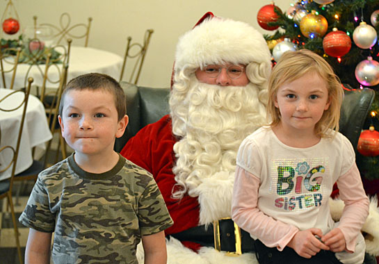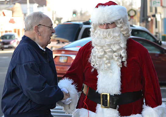 Santa Claus (above) was greeted by Van Wert Mayor Louis Ehmer on Friday morning as he rode into the downtown area on a Van Wert Fire Department truck. After greeting the mayor, Santa took some time to get Christmas wishes from a number of local children in The Hotel Marsh (below). (photos by Dave Mosier/Van Wert independent)
