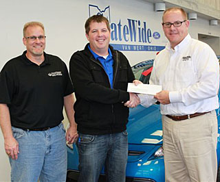 Steve Munroe (right) presents the Drive One 4 UR School proceeds to Lincolnview Booster President Dan Brant and Treasurer Mark McCleery.