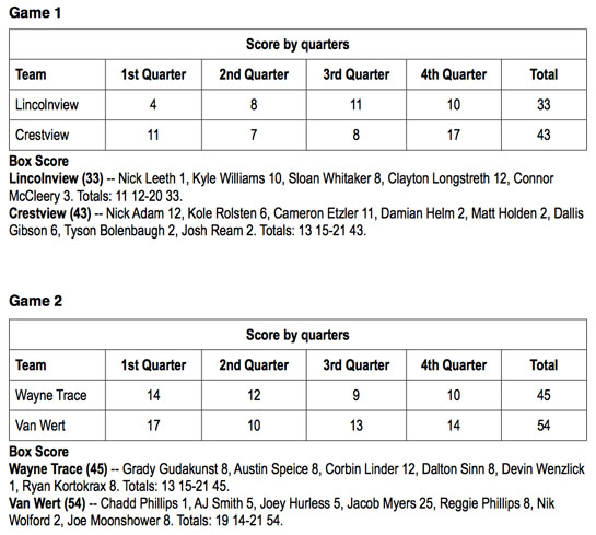 Van Wert was led by a 25-point performance from Jacob Myers — the only Cougar in double figures — although Reggie Phillips and Joe Moonshower both added 8 points for Van Wert. The Raiders were more balanced, offensively, with Corbin Linder leading Wayne Trace with 12 points and Grady Gudakunst, Austin Speice, Ryan Kortokrax and Dalton Sinn also adding 8 points for the Raiders.
