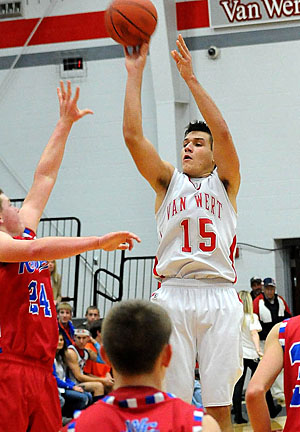 Van Wert's Jacob Myers (15) led all scorers in the first night of the Van Wert County Hospital Tip-Off Tournament, scoring 25 points to lead the Cougars to a 54-45 win over Wayne Trace. (Jan Dunlap/Van Wert independent)