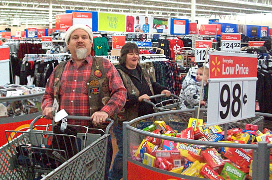 A member of the Wetzel Motorcycle Club shops to provide Christmas toys for needy Van Wert County children.