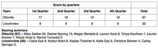Offensive leader for Lincolnview was Clair Dye, who scored 9 points and had three assists in the game, while Kaitlyn Brant had 8 points. Carley Springer had 8 rebounds for the Lancers. Ottoville’s Abby Siefker was the game’s leading scorer with 20 points, while Rachel Beining added 10 points for the Big Green.