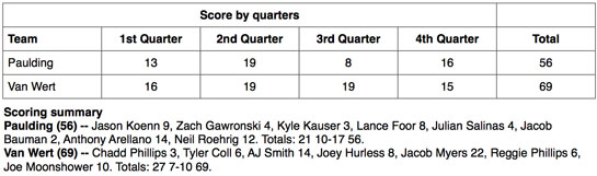 Jake Myers led Van Wert with 22 points, while AJ Smith scored 14 points and Joe Moonshower added 10 points for the Cougars. Paulding was led by Anthony Arellano’s 14 points, while Neil Roehrig scored 12 points and Jason Koenn added 9 points for the Panthers.
