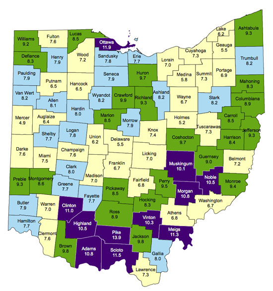 Five counties had unemployment rates at or above 11.0 percent during November. The counties with the highest rates, other than Pike, were: Ottawa, 11.9; Scioto, 11.5; Meigs, 11.3; and Clinton, 11.0 percent.