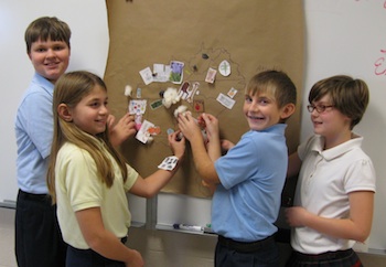 The 5th grade students at St. Mary of the Assumption School have been studying the states of the United State. They brought in samples of products and glued them to a large map. Nathan, Caton, Mason and Risa are pointing to the cotton and coal they added to the map. Some students brought in peach desserts to share with their classmates. The students decided that the best part of studying the South was sampling the foods.
