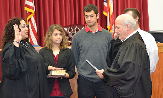 Van Wert Municipal Court Judge Jill Leatherman was sworn in Thursday to her first full term in office by Van Wert County Common Pleas Judge Charles D. Steele. Surrounding Leatherman is her children and husband, Kurt.(Dave Mosier/Van Wert independent)