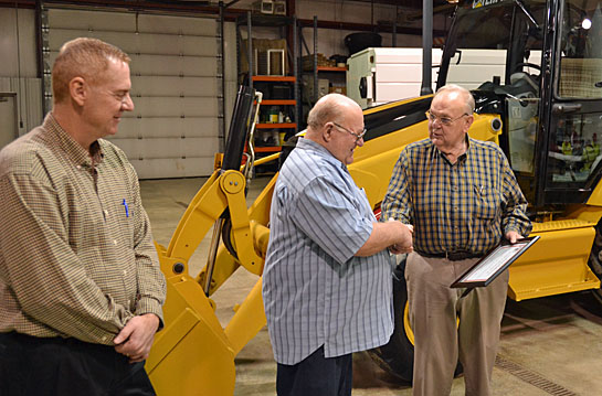 City officials and employees were on hand Thursday to recognize longtime city employee Donald Mengerink Sr. for his decades of service in the Water Distribution Department. Mengerink (center), a backhoe operator with 31 official years of city service, but whose work with the city goes back to the 1950s, is shown being congratulated by Mayor Louis Ehmer (right) and Safety-Service Director Jay Fleming at his retirement party. (Dave Mosier/Van Wert independent)