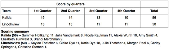The Dye sisters, Katie and Claire, led the scoring for the Lancers. Katie Dye had 18 points, while her sister scored 11 for Lincolnview. The Wildcats had three players in double figures, led by Summer Holtkamp and Nicole Kaufman, each with 11 points, and Alexis Wurth with 10. Brandi Merchman had 9 points for Kalida.