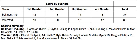Van Wert led 19-12 at the end of a quarter, but then poured it on, outscoring the Braves 20-3 in the second quarter to lead by 24 points, 39-15, at the half. Although the reserves played most of the second half, the Cougars still outpointed Bellmont 30-22 for the 32-point margin of victory.