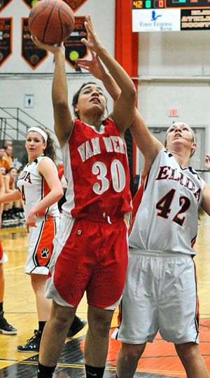 For the first time all year, Van Wert’s Erin Morrow outpointed her big sister, Alex, as the freshman post player scored 16 points, including three treys, while her sister, a senior, added 11 points and Molly Gamble, also a senior scored 12 points for the Lady Cougs. Elida had two players who scored 7 points each.