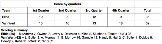 For the first time all year, Van Wert’s Erin Morrow outpointed her big sister, Alex, as the freshman post player scored 16 points, including three treys, while her sister, a senior, added 11 points and Molly Gamble, also a senior scored 12 points for the Lady Cougs. Elida had two players who scored 7 points each.