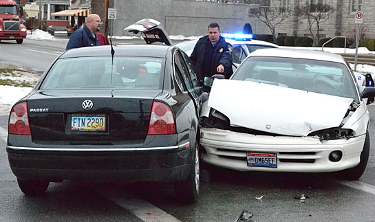 This two-car accident occurred at the intersection of Washington and Sycamore streets on Monday afternoon. One person was taken to Van Wert County Hospital for treatment by a Van Wert Fire Department EMS squad unit, but no one was apparently seriously hurt.(Dave Mosier/Van Wert independent)
