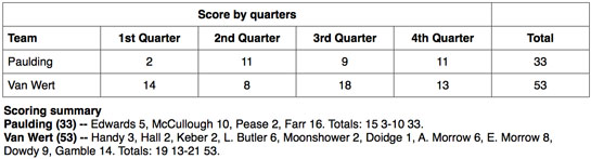 With top scorer Alex Morrow held to just 6 points — and three of those points came on a trey in the first quarter — Molly Gamble again stepped up offensively for Van Wert, scoring 14 points to lead the Cougars. Alexis Dowdy had 9 points for Van Wert, while Morrow’s sister, Erin, scored 8 for the Cougar cause. Paulding had two players in double figures, led by Jessica Farr’s 16 points. Sierra McCullough added 10 points for the Panthers, who had only four players on the scoreboard in the game, versus 10 for Van Wert.