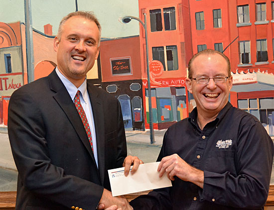 Jon Bagley (left), a member of the Van Wert County Hospital Board of Trustees, accepts a check for $50,000 from County Foundation Trustee Andy Czajkowski as part of the Foundation's multiyear commitment to the hospital's ER project. (Dave Mosier/Van Wert independent)