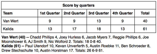 Cougar top scorer Jacob Myers was held to just 7 points on the night – far below his 20-point average – and the 93-percent free throw shooter also went 0-for-3 from the line. No Van Wert player made it into double figures, although AJ Smith was close with 9 points, all of which came on three-pointers. The Wildcats had four players in double figures, led by Austin Horstman’s 17 points. Austin Roebke scored 11 points for Kalida, while Paul Utendorf and Drew Stechschulte added 10 points apiece.
