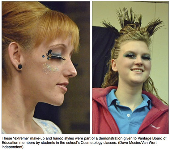 The board also accepted the resignation of Nancy Moore, network system instructor, for the purpose of retirement, and watched a presentation from several Vantage Cosmetology students related to a classroom project on “extreme” hairdos and make-up, and watched a demonstration of a make-up stencil device (see photos).