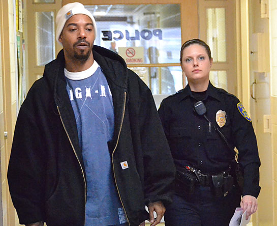 Elmico Crisp (left) of Van Wert is shown being escorted by Officer Brandi Linder from the Van Wert Police Department Tuesday afternoon after he turned himself in on drug-trafficking charges. Crisp, 35, was one of seven people not initially arrested as part of an undercover drug investigation conducted by the Van Wert Police Department. Crisp was indicted by the Van Wert County Grand Jury on two counts of trafficking in cocaine, both felonies of the fourth degree. Dave Mosier/Van Wert independent