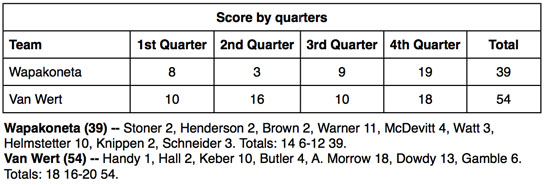 Van Wert had a two-point lead, 10-8, at the end of the first quarter, but outscored the Redskins 16-3 in the second period to go up by 15, 26-11, at the half. Both teams scored 28 points in the second half to maintain the 15-point margin of victory.