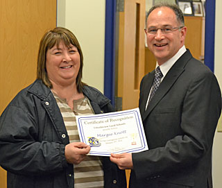 Superintendent Doug Fries presented Knott with a certificate honoring her for her quick thinking in getting students out the rear exit of the bus as fire engulfed the front of the vehicle. The bus was considered a total loss from the fire.