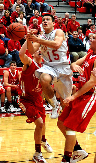 Van Wert's Jacob Myers (15) threads through the tall trees of St. Henry to put in one of his few baskets in a 50-36 loss to the Redskins on Saturday. (Jan Dunlap/Van Wert independent)