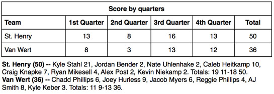 St. Henry jumped out to a five-point lead, 13-8, at the end of the first quarter and upped that to 10 points at the half by outpointing the Cougars 8-3 in the second stanza. The pattern continued in the second half, as the Redskins outscored Van Wert 29-25 in the half for the 14-point win.