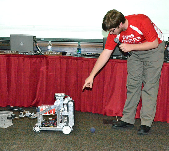 VWHS Robotics Team member Matt Saunier demonstrates the team's robot during Wednesday's meeting of the Van Wert City Board of Education. (Dave Mosier/Van Wert independent)