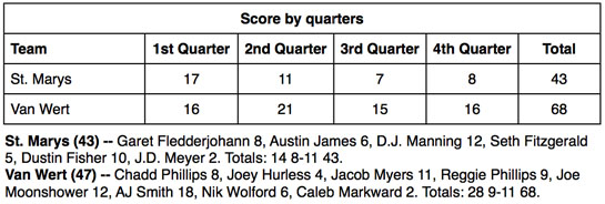 St. Marys got out to a fast start, but the Van Wert Cougars put the finish on the game, winning in a runaway, 68-43, in Friday’s Western Buckeye League contest played in the Cougar’s Den.