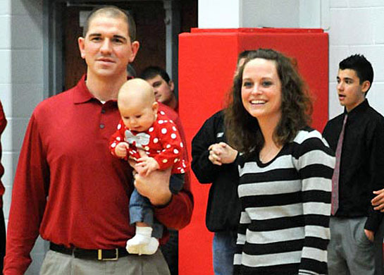 New Van Wert football head coach Keith Recker makes an appearance with his wife, Jodie, and daughter Molly during Friday night’s boys’ basketball game against St. Marys. (Jan Dunlap/Van Wert independent)