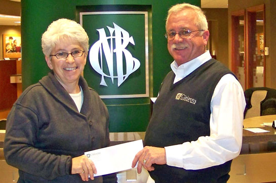 Pat Ryan (right) of Citizens National Bank in Van Wert presents a check for $1,000 to Van Wert Parks Director Sue Heppeard to help defray the cost of constructing a concession stand/restroom facility in Jubilee Park. (photo submitted)