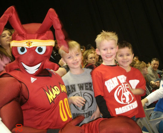 Nearly 100 youths from the YMCA of Van Wert County recently participated in a basketball clinic with the Fort Wayne (Ind.) Mad Ants. Participation in the clinic also entitled participants and their families to Mad Ants game tickets. Shown are Y members (from the left) Sam Houg, Keaton Foster and Tyce McClain with the Mad Ant mascot at “Van Wert YMCA Game Night” in Fort Wayne. (YMCA photo)