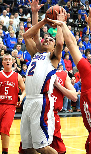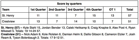 Again, though, St. Henry rallied and was ahead 44-41 with 4.7 seconds left when Nick Adam let fly a three-pointer that tied the game and forced the contest into overtime.