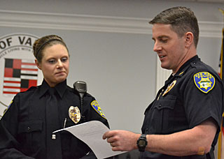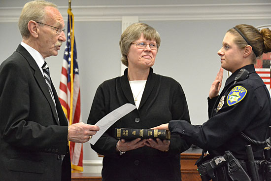 Police Chief Joel Hammond first spoke, noting that it is always a significant accomplishment for a dispatcher to rise through the ranks to become an officer. Both of the last two city police officers sworn in have been former dispatchers. Longtime dispatcher and former county corrections officer Bryon Wells was sworn in last fall.