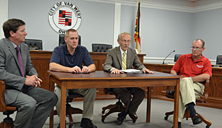 A delegation (from the left) Chuck Koch, Jay Fleming, Don Farmer and Andy Czajkowski that met with ODOD officials on Monday talk about the results of that meeting on Tuesday. (Dave Mosier/Van Wert independent)
