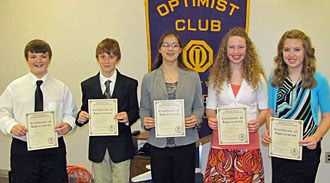 Wade Healey won first place in the competition for boys and Ann Brake won first place in the competition for girls. They each received gold medallions and checks for $150. In addition, the first-place finishers will participate in the next level of competition against winners from other Optimist Clubs. Winners competing at the district level contest have the chance to win scholarships.