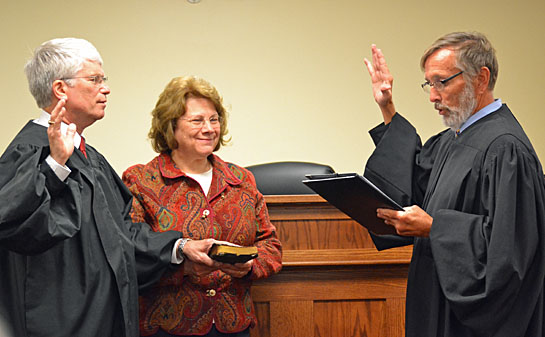 Former assistant county prosecutor Kevin H. Taylor was given the oath of office by his predecessor, Judge Rex Fortney, who retired at the end of 2011 after 27 years on the Probate-Juvenile Court bench. Taylor’s wife, Kathy, held the Bible on which he placed his hand during the swearing-in ceremony.