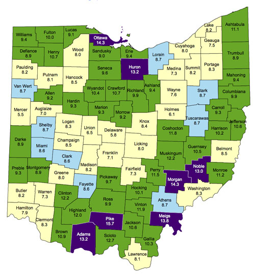 Seven counties also had jobless rates at or above 13.0 percent. Those included Pike, 15.7 percent; Morgan and Ottawa, 14.3 percent; Meigs, 13.8 percent; Adams and Huron, 13.2 percent; and Noble, 13.0 percent (click here for a PDF of the map, with additional information).