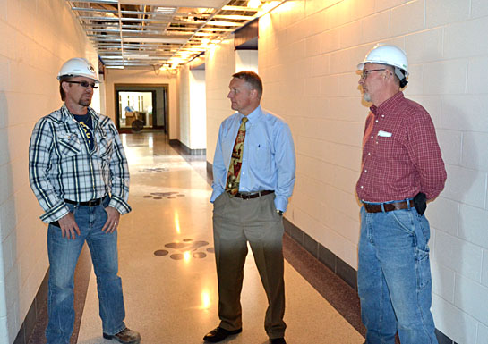 Van Wert City Board of Education members toured the new grades 1-5 elementary school building now under construction following a special board meeting Thursday evening. Shown are (from the left) Project Manager Larry Geren, VWCS Treasurer Mike Ruen and VWCS Maintenance Supervisor Randy Stemen. During the special meeting, the board awarded several bids for the Jefferson Elementary renovation project, but decided to rebid the plumbing portion of the project because bids were too high. Bids awarded include the general trades package to Alexander & Bebout, $1,578,450; fire protection, Shambaugh & Son, $73,865; HVAC, Vaughn Industries, $934,600; and electrical/technology cabling, Koester Electric, $730,000. (Dave Mosier/Van Wert independent)