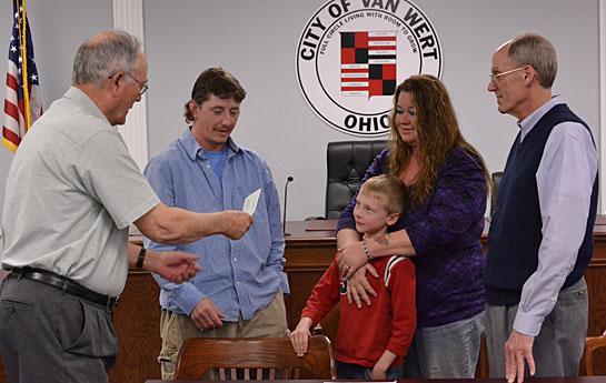 Mixed Motor Carriers, an auto-transport business begun by Brad and Melissa Lintermoot of Venedocia, was given a $15,000 county loan to help buy a three-car carrier to be used to transport vehicles, including four-wheelers, from one place to another. Here, Van Wert County Commissioner Clair Dudgeon presents a check to the Lintermoots, who brought their son, Bryden, with them to the loan closing. Van Wert City Council President Gary Corcoran, who also chairs the county Revolving Loan Committee, looks on. (Dave Mosier/Van Wert independent)