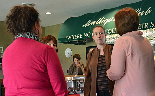 Mulligan’s Pub & Bistro manager Kindra Butler (above) cuts the ribbon on the renovated dining facility as owners and staff, Mayor Don Farmer and Van Wert Area Chamber of Commerce board members look on. The Chamber also held a Business After Hours function at Mulligans following the ribboncutting. Below, new Van Wert Economic Development Director Sarah Smith (striped top) chats with (from the left) Van Wert Manor Administrator Jacque Welch, Economic Development Administrative Assistant Darlene Myers and Chamber President/CEO Susan Munroe. (Dave Mosier/Van Wert independent)