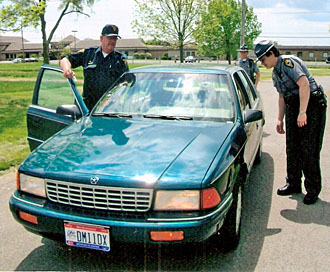 Inspector Alan Joseph, Trooper JJ McCain and Trooper Deb Tracey inspect a car.