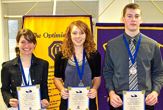 The Van Wert Optimist Club judged students in its essay contest based on the topic “How my Positive Outlook Benefits my Community.” Three area students were honored during the March 8 Optimist Club meeting while presenting their essays. Layne Callow, a senior at Crestview High School, won first place and was awarded a $200 check and gold medallion. In addition, her winning essay was submitted to the district level to be judged. Katelyn Etter, a student from Van Wert High School, finished in second place and was awarded a $100 check and silver medallion. Third place was awarded to Nikolas Wolford, also from Van Wert High School, who received a $50 check and a bronze medallion. These students did a wonderful job of articulating this year’s theme. Judges this year were Bitsy Clark, Amy Prichard, and Paul Cearns. There were 48 essay entries from area students. (Optimist Club photo)