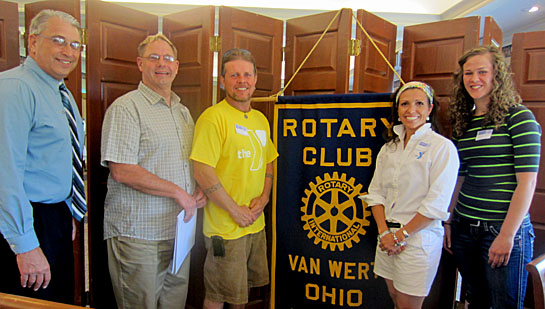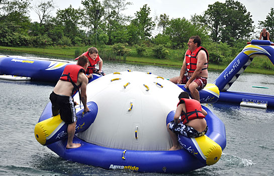 YMCA Camp Clay’s Aqua Park (shown below) will be opening this Friday, May 25, for the summer. Opening day will be Rotary Day and admission is free to everyone. Shown are (above, from the left) Rotarians Dave Roach and Gary Taylor; Camp Clay Facilitator Clint Myers; YMCA Membership/Marketing Director J.J. McClain and Camp Clay summer intern Bethany Behnfeldt. Starting this Friday, the Aqua Park will be open Mondays-Thursdays, noon-4 p.m., and Fridays-Sundays and holidays, noon-6 p.m. For more information, call the Y at 419.238.0443 or visit its website at www.vwymca.org. (YMCA photos)