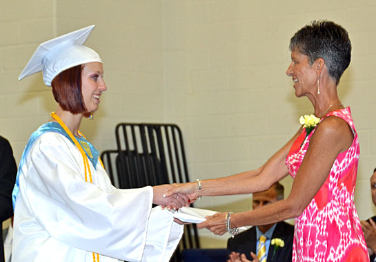 Lincolnview Valedictorian Samantha Karalunas (left) receives her diploma from Board of Education member Cindy Miller during commencement ceremonies held Sunday afternoon in the high school gymnasium. Click here for a special graduation publication. (Dave Mosier/Van Wert independent)