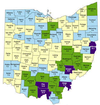 At the other end of the scale, five counties had unemployment rates above 10.0 percent during May. The counties with the highest rates were Pike, 12.6: Meigs, 11.7; Scioto, 10.5; Morgan, 10.4; and Jefferson, 10.1 percent.
