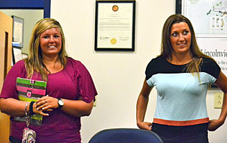 New elementary teachers Hannah Rockhold (left) and Tara Gustwiller attended Tuesday's meeting of the Lincolnview Local Board of Education. (Dave Mosier/Van Wert independent)