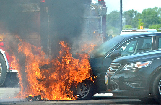 This car ignited in front of Walmart shortly before 11 a.m. Wednesday, but was quickly extinguished by the Van Wert Fire Department, which arrived on scene shortly after the fire was reported. (Dave Mosier/Van Wert independent)