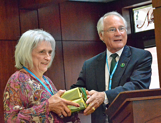 Wright State University President David Hopkins presents Dee Whitcraft, president of the Western Ohio Educational Foundation (WOEF) Board, a gift to honor that organization’s 50th anniversary. (Dave Mosier/Van Wert independent)
